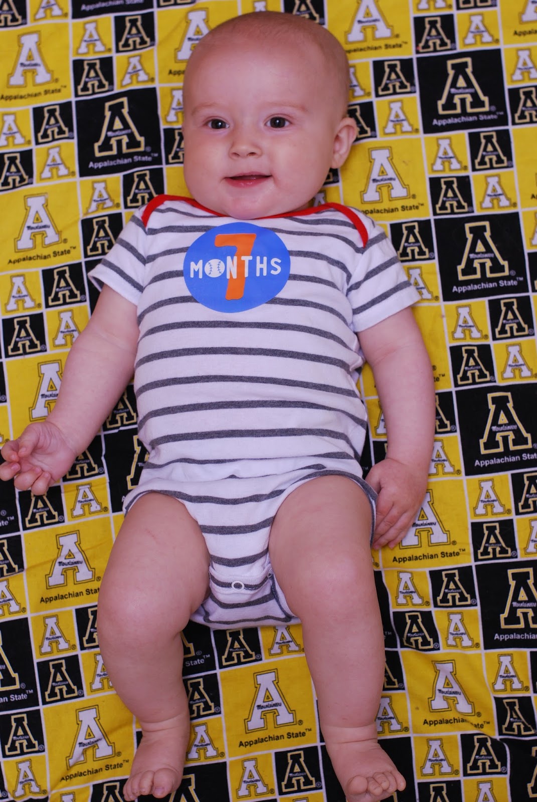 Joey is 7 months... wow! He is such a happy baby, loves to be held by everyone, is very active and into everything he can reach, thinks most everything is funny (especially mama tickling him and being "dropped" from high to low), loves his bouncer and loves his siblings.